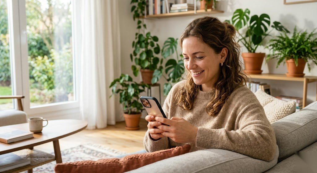Person nutzt ihr Smartphone mit einem deutschen Mobilfunkvertrag in einem modernen Wohnzimmer